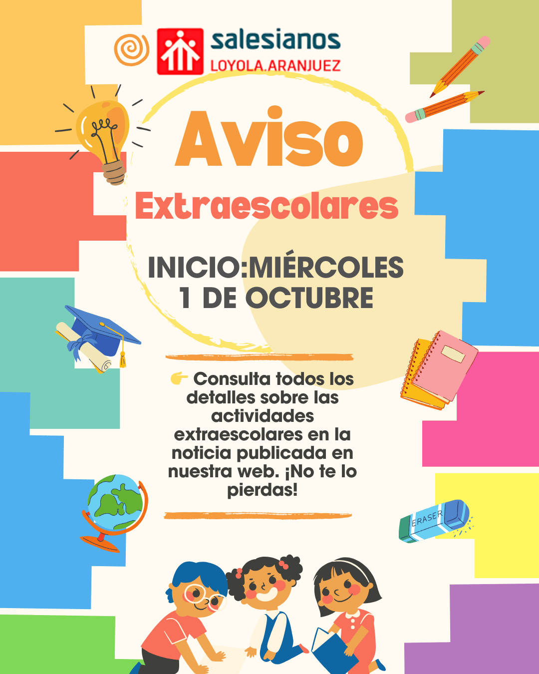 ¡Comienzan las actividades extraescolares en nuestro centro! A partir del miércoles 1 de octubre, los alumnos inscritos en las actividades podrán disfrutar de sus sesiones en el horario establecido.