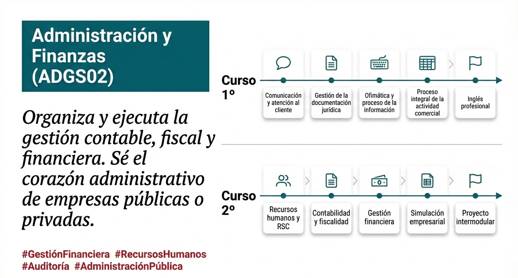El ciclo formativo de administración y finanzas capacita para la organización y realización de la administración y gestión de personal, las operaciones económico-financieras y la información y asesoramiento a clientes o usuarios.