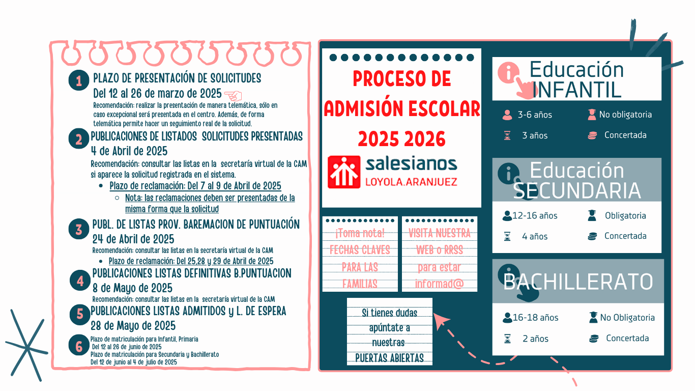 - Los solicitantes deberán acudir al centro educativo en la fecha y hora asignadas con toda la documentación requerida.