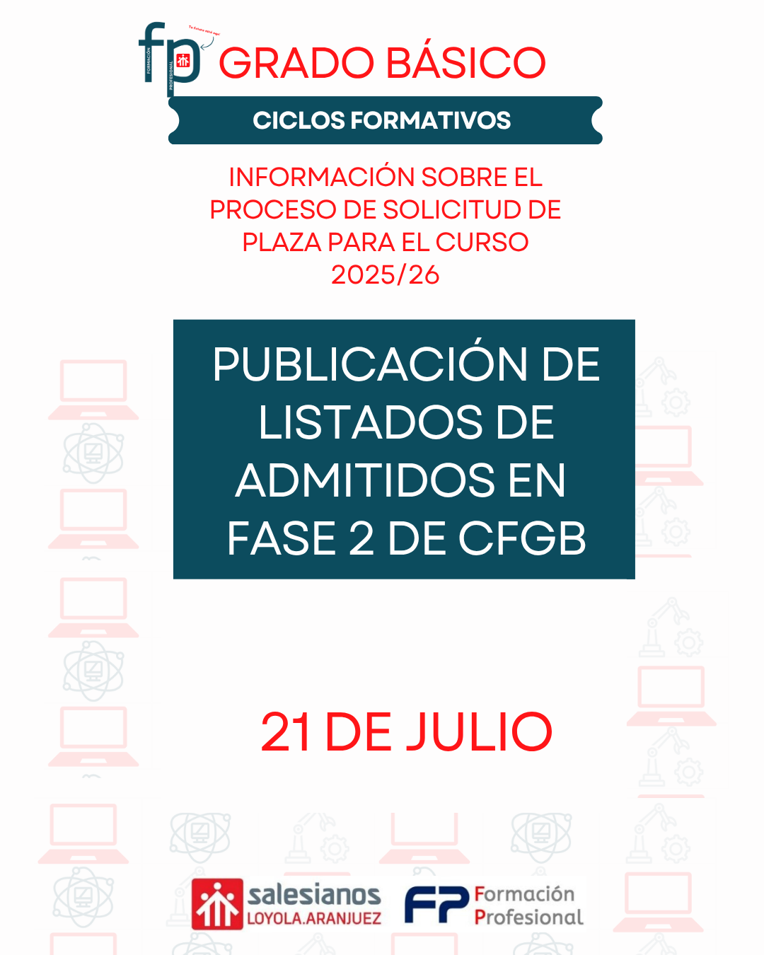 Importante: Todos los admitidos deben realizar la matrícula los días 22 y 23 de julio, en el horario y lugar que se indica según el ciclo formativo: